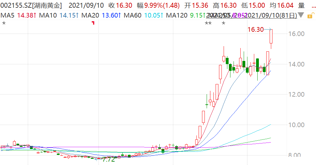 湖南黄金(002155.Z)连续第二日涨停,报16.3元,股价创2015年以来新高,市值196亿元。公司是光伏金属锑矿龙头,2020年公司锑品产量为34967吨,2021年上半年为18872吨,占全国总产量的20%。 锑广泛应用于于阻燃剂、蓄电池及金属合金、化学制品等领域。其中阻燃材料占比55%左右,铅酸电池占比15%左右,聚
