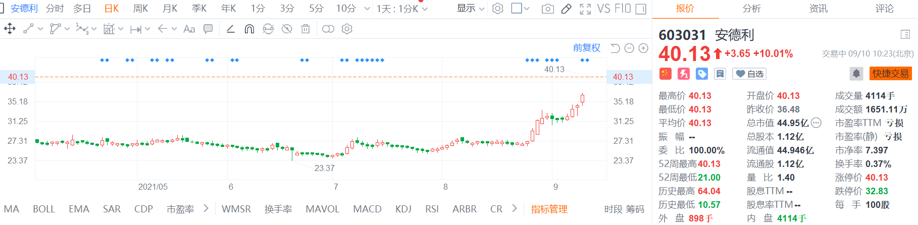 安德利(603031.H)一字板涨停,报40.13元创去年6月份以来新高,最新总市值44.9亿。 公司昨日公告称,拟收购亚锦科技36%的股权,价款暂定为不低于24亿元。公司大股东陈学高收购安德利现有的全部资产和业务,包括商业零售业务、其他任何现有业务及与该等业务相关的全部负债,资产出售交易的交易价格暂定不