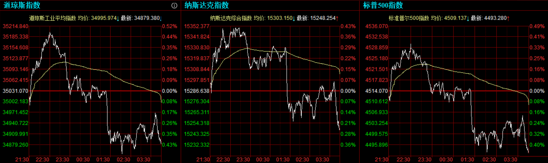 美股三大指数集体收跌,其中道指、标普500指数连跌4日。投资者仍在关注新冠德尔塔变异毒株的蔓延、经济重新开放和美联储政策等因素。美国上周初请失业救济人数降至31万,好于市场预期。欧央行放缓购债速度。 道指收跌151.69点,或0.43%,报34879.38点;纳指跌38.38点,或0.25%,报15248.25点;标普500指