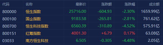 受科技股大跌影响,港股三大指数集体大跌。恒生科技指数跌4.52%报6560点,恒指跌2.3%报25716点下跌逾600点,国指跌2.81%报9183点。 盘面上,大型科技股全线大跌,尤其是网易、腾讯等游戏股领跌,二者分别跌11%及8.48%,快手大跌近7%,京东、阿里巴巴皆大跌近6%,美团、百度跌超4%;恒大概念股延续跌势,