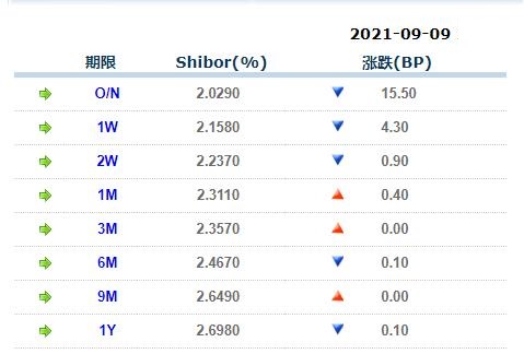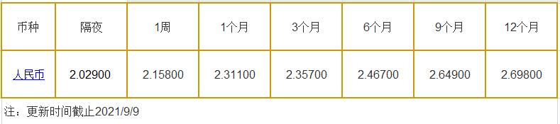 9月9日中国银行间同业拆借利率人民币: 隔夜报2.02900%, 1周期报2.15800%, 1月期报2.31100%, 12月期报2.69800%。 中国银行同业拆放利率(ChiaItrakOffrdRat,简称CHIOR)。同业拆借利率指金融机构同业之间的短期资金借贷利率。它有两个利率,拆进利率表示金融机构