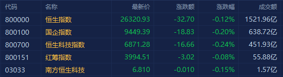港股三大指数集体收跌,恒指跌0.12%报26320点,国指跌0.2%报9449点,恒生科技指数跌0.24%报6871点。 盘面上,电力板块领涨,大唐新能源飙涨近16%破顶,龙源电力、新天绿色能源拉升均创历史新高;大中华地区逐步放松过境限制,濠赌股、旅游及观光股、餐饮股、航空股表现活跃,美兰空港大涨近7%;大型科技