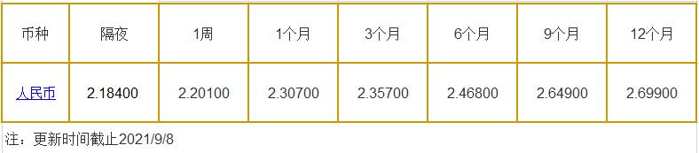 9月8日香港银行间同业拆借利率港币: 隔夜报0.03786%, 1周期报0.03946%, 1月期报0.06863%, 12月期报0.35125%。 香港银行同业拆放利率HIOR(HogkogItrakOffrdRat),指香港货币市场上,银行与银行之间的一年期以下的短期资金借贷利率,是从伦敦同业拆借利率(LIOR)变