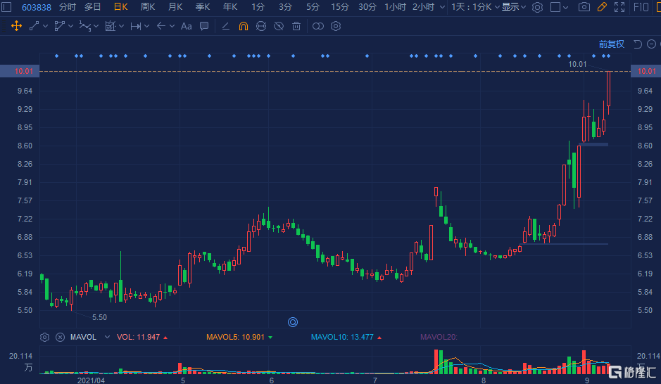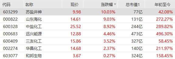延续昨日升势,磷化工概念股今日继续集体走强。其中,川恒股份、云天化封涨停板,川金诺涨近10%,川发龙蟒涨近6%,兴发集团涨近5%,鲁北化工宏达股份涨超3%。 今年以来,磷化工产业链相关产品价格持续上涨。数据显示,磷酸一铵和磷酸二铵等磷肥原料9月7日报价分别为3400元/吨和3430元/吨,继续处于上涨