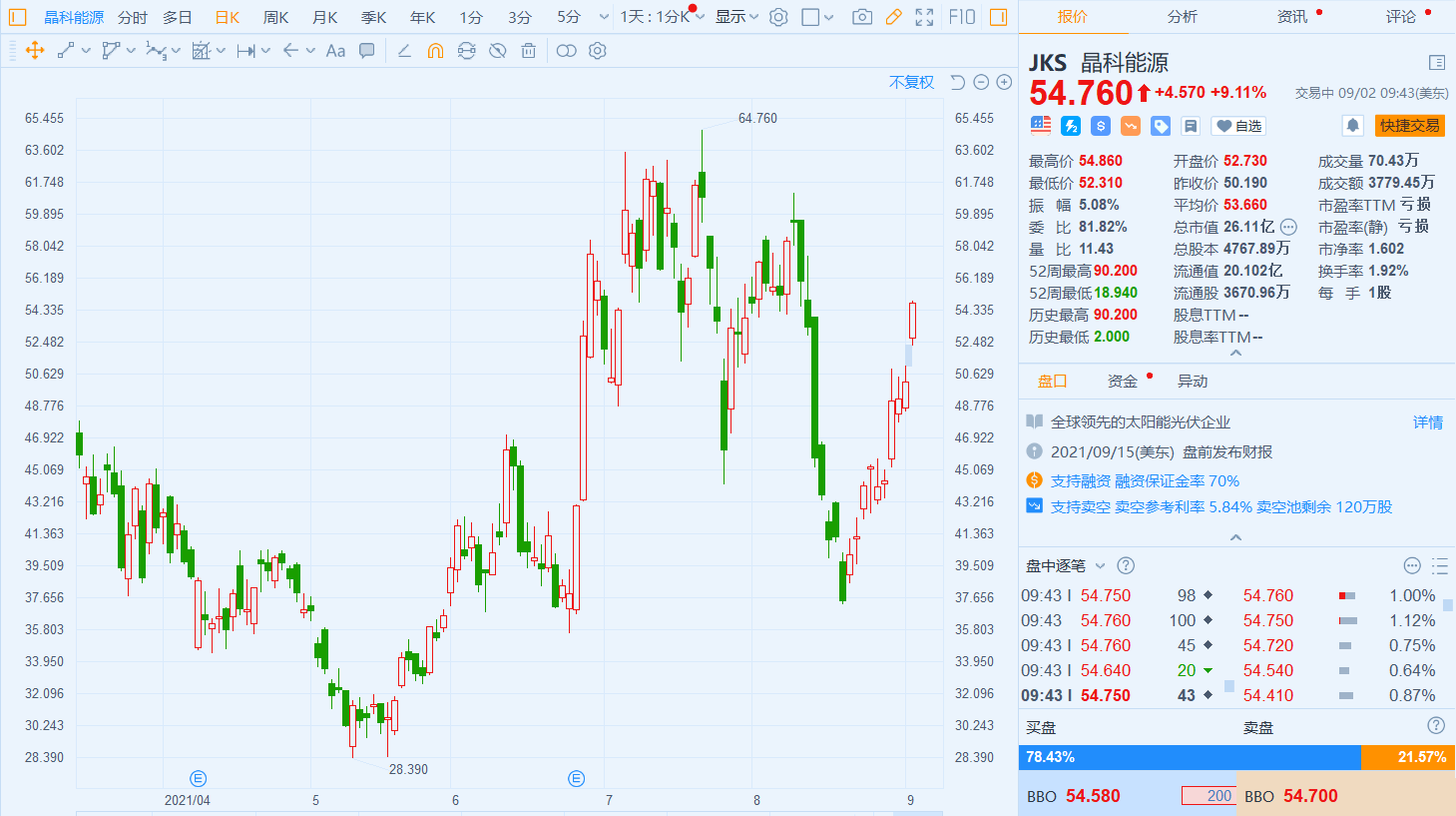 晶科能源(JK.U)大幅走高,现涨幅为9.11%,报54.76美元,暂成交3779.45万美元,最新总市值为26.11亿美元。 8月31日,晶科能源与宁德时代在福建宁德签订战略合作协议。双方在储能业务、整县推进光储综合解决方案、全球市场光储合作、产业链上下游碳中和推进、基于创新光储架构及系统集成方案的联合研发