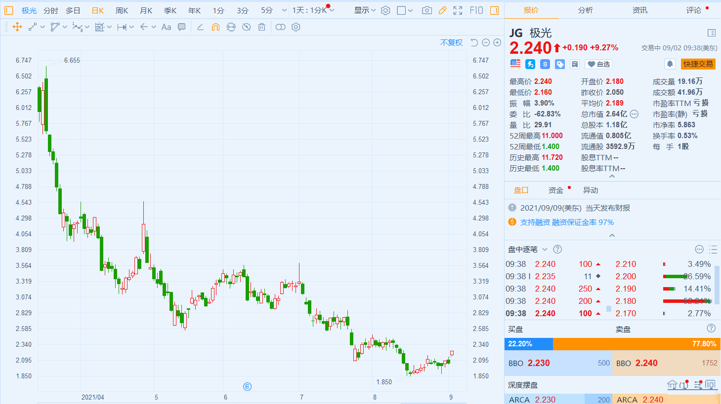 极光(JG.U)今日股价高开,现涨幅为9.27%,报2.24美元,最新总市值为2.64亿美元。 富时罗素指数公司宣布,确认将极光纳入富时全球股票指数-中国指数、微型盘股指数、完整全市场指数,从2021年9月17日收市后生效。市场人士认为,将进一步提升极光的资本市场知名度和影响力。
