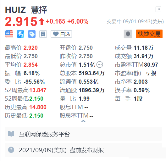昨日大幅收涨13.17%的慧择(HUIZ.U)今日继续走高,现涨6%报2.915美元。 据悉,慧择将于北京时间2021年9月9日晚间(美东时间9月9日美股盘前)公布其2021年第二季度及上半年财务业绩。此外,慧择曾于8月25日宣布,公司拟收购盛世安康,加速推进线上线下融合及开放平台战略。此前17日亦公布,董事长兼首席执