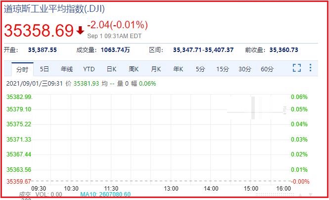 美股小幅高开,道指涨0.09%,纳指涨0.33%,标普500指数涨0.20%。蔚来汽车跌近5%,由于供应链的限制,公司下调第三季度交付预期。小鹏汽车跌超3%,8月交付7214辆汽车,同比增长172%。 1、截止发稿时间,道琼斯报于:35361.54,成交量:1557.83万 2、美股快报:三公布的“小非农”数据显示,美国8月