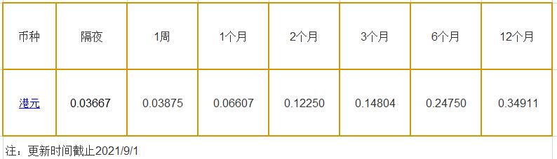 9月1日香港银行间同业拆借利率港币: 隔夜报0.03667%, 1周期报0.03875%, 1月期报0.06607%, 12月期报0.34911%。 香港银行同业拆放利率HIOR(HogkogItrakOffrdRat),指香港货币市场上,银行与银行之间的一年期以下的短期资金借贷利率,是从伦敦同业拆借利率(LIOR)变