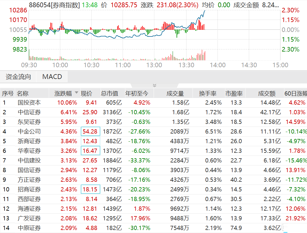 券商股直线拉升,板块指数涨近2%,其中,国投资本涨停,中信证券领涨超6%,东吴证券涨超5%,中金涨超4%,浙商证券、华泰证券和中信建投涨超3%,招商证券涨超2%。