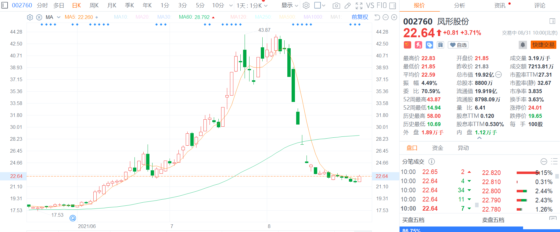 凤形股份(002760.Z)涨约4%,报22.64元,总市值20亿元。 凤形股份披露2021年半年度报告,报告期内,公司实现营业收入4.19亿元,同比增长43.62%;归属于上市公司股东的净利润4122.14万元,同比增长41.18%;归属于上市公司股东的扣除非经常性损益的净利润3258.25万元,同比增长95.37%;经营活动现金净流入