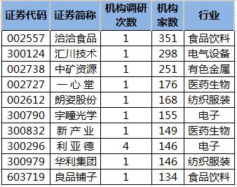 统计显示,近5个交易日(8月19日至8月25日)沪深两市约107家上市公司被机构调研。机构调研榜单中,共有56家公司获20家以上机构扎堆调研。洽洽食品(002557)最受关注,参与调研的机构达到351家;汇川技术(300124)被298家机构调研,榜单中排名第二。 机构调研次数来看,有2家公司被机构调研4次,分别是利亚德