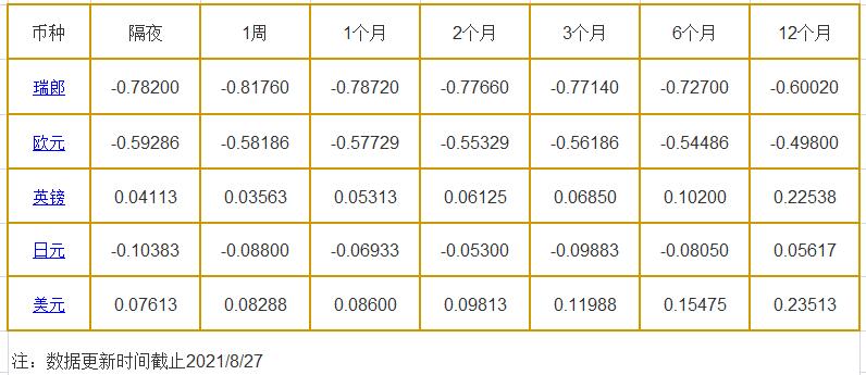 8月27日伦敦银行同业拆借利率: 隔夜LIOR:瑞郎报-0.78200%,欧元报-0.59286%,英镑报0.04113%,日元报-0.10383%,美元报0.07613%; 1周LIOR:瑞郎报-0.81760%,欧元报-0.58186%,英镑报0.03563%,日元报-0.08800%,美元报0.08288%; 1个月LIOR:瑞郎报-0.78720%,欧元报-0.57729%,英镑报0.053