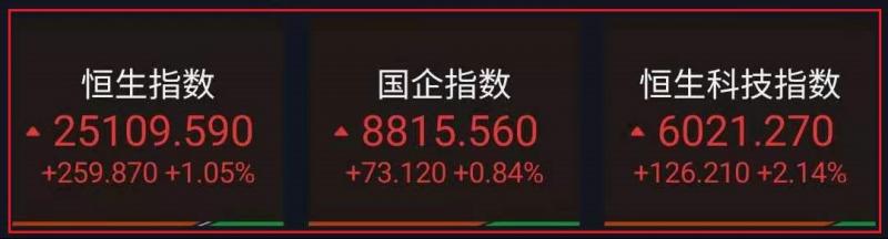 昨日回顾: 1.恒指昨早市先高开320点至25169点,其后稍作拉锯而轻回至25061点。惟在买盘支持下,大市再度回升,一度涨超2%,午后涨幅收窄。截至收盘,港股恒指涨1.05%,报25109.59点,国企指数涨0.84%,红筹指数涨1.06%; 2.恒生科技指数(6009.68114.621.94%)大涨2.14%,京东健康(645.9010.16%)涨