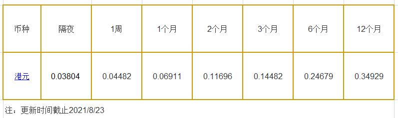 8月23日香港银行间同业拆借利率港币: 隔夜报0.03804%, 1周期报0.04482%, 1月期报0.06911%, 12月期报0.34929%。 香港银行同业拆放利率HIOR(HogkogItrakOffrdRat),指香港货币市场上,银行与银行之间的一年期以下的短期资金借贷利率,是从伦敦同业拆借利率(LIOR)