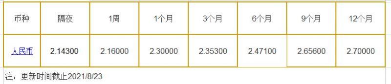 8月23日中国银行间同业拆借利率人民币: 隔夜报2.14300%, 1周期报2.16000%, 1月期报2.30000%, 12月期报2.70000%。 中国银行同业拆放利率(ChiaItrakOffrdRat,简称CHIOR)。同业拆借利率指金融机构同业之间的短期资金借贷利率。它有两个利率,拆进利率表示金融机构