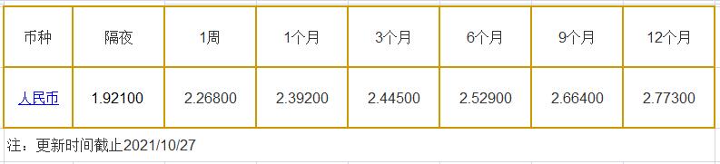 10月27日中国银行间同业拆借利率人民币: 隔夜报1.92100%, 1周期报2.26800%, 1月期报2.39200%, 12月期报2.77300%。 中国银行同业拆放利率(ChiaItrakOffrdRat,简称CHIOR)。同业拆借利率指金融机构同业之间的短期资金借贷利率。它有两个利率,拆进