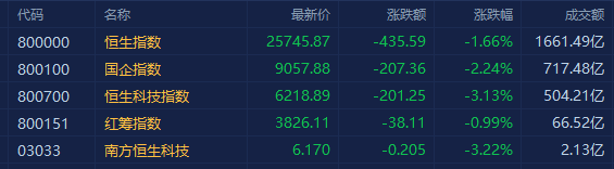 股主要指数全线大跌,行业板块齐挫,市场情绪降至冰点。科网股再度下跌,致恒生科技指数大跌3.13%报6218点,已走出5连跌且逼近低价,恒指跌1.66%报25745点,国指跌2.24%报9057点。 盘面上,大型科网股京东、百度、网易大跌超5%,腾讯、阿里巴巴、快手大跌逾4%,快手再创历史低价;教育股、恒大概念股、