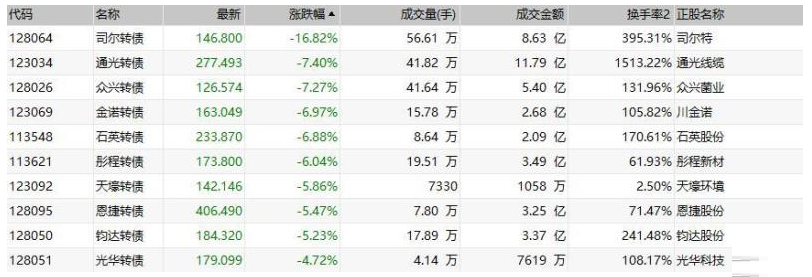中证转债指数午盘跌0.16%,司尔转债跌超16%,通光转债和众兴转债均跌超7%,金诺转债、石英转债和彤程转债均跌逾6%,天壕转债、恩捷转债和钧达转债均跌逾5%;联泰转债涨超11%,华钰转债和晶科转债均涨超8%,中钢转债涨逾7%,滨化转债涨近5%。