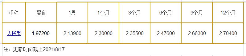 8月17日中国银行间同业拆借利率人民币: 隔夜报1.97200%, 1周期报2.13900%, 1月期报2.30000%, 12月期报2.70400%。 中国银行同业拆放利率(ChiaItrakOffrdRat,简称CHIOR)。同业拆借利率指金融机构同业之间的短期资金借贷利率。它有两个利率,拆进利率表示金融机构