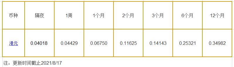 8月17日香港银行间同业拆借利率港币: 隔夜报0.04018%, 1周期报0.04429%, 1月期报0.06750%, 12月期报0.34982%。 香港银行同业拆放利率HIOR(HogkogItrakOffrdRat),指香港货币市场上,银行与银行之间的一年期以下的短期资金借贷利率,是从伦敦同业拆借利率(LIOR)