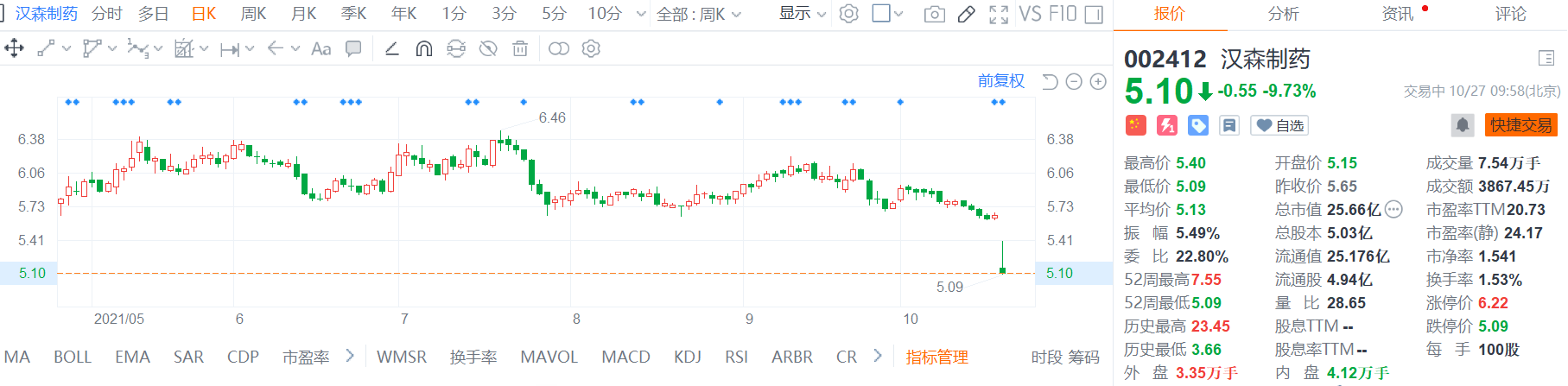 汉森制药(002412.Z)接近跌停,报5.1元创2013年6月份以来新低,总市值25.7亿。 公司10月26日收到控股股东海南汉森告知函,海南汉森执行事务合伙人、公司实际控制人刘令安于10月25日收到中国证监会的《立案告知书》,因涉嫌操纵证券市场,中国证监会决定对刘令安立案。
