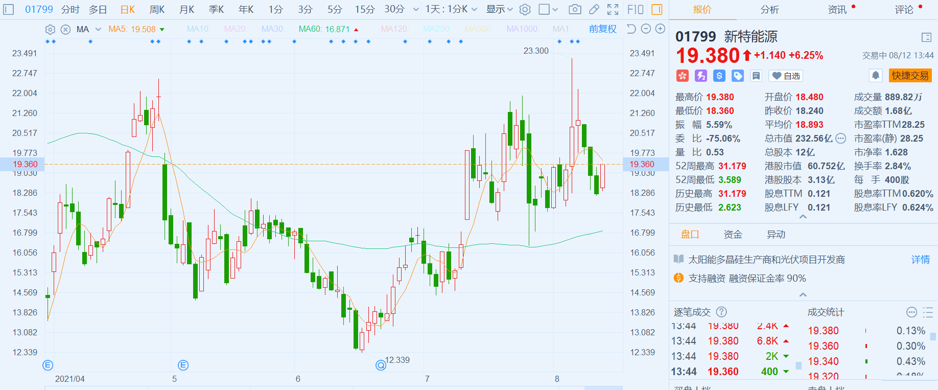 新特能源(1799.HK)涨逾6%,报19.38港元,总市值233亿港元。 根据联交所最新权益披露资料显示,8月5日,新特能源获JorgaChaaCo.以每股均价19.7758港元增持好仓269.44万股,涉资约5328.39万港元。8月6日,新特能源再度获JorgaChaaCo.以每股均价21.3573港元增持好仓203.68万股,涉资约43