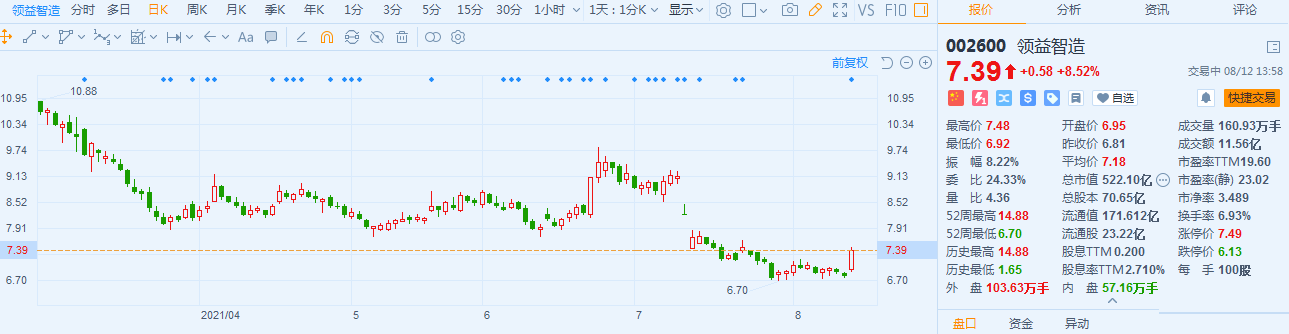 领益智造(002600.Z)午后走强,盘中一度涨近9.7%,现回落至7.39元,涨幅8.5%,最新总市值522.1亿,换手率7%。 公司昨日公告称,控股股东领胜投资直接持有公司限售股41.395亿股,占公司总股本的58.59%,上述限售股将于2021年8月13日上市流通。承诺自解禁之日起6个月内不主动减持相关限售股。