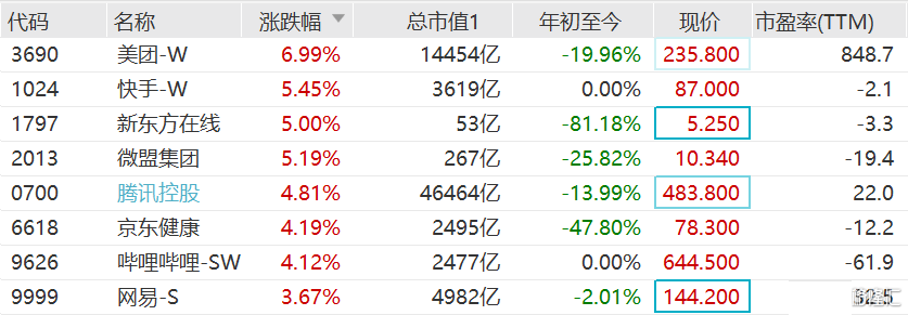 港股大型科技股今日盘中集体走强,腾讯涨近5%,美团涨近7%,均为连续第二日反弹;京东集团、网易涨超3%,快手涨超5%,哔哩哔哩涨超4%。一改此前的净卖出态势,最近三个交易日,南下资金持续净买入美团共计7.156亿港元;连续两个交易日净买入腾讯,共计92.57亿港元。 有分析人士称,以腾讯为代表的科网股
