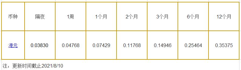 8月10日香港银行间同业拆借利率港币: 隔夜报0.03830%, 1周期报0.04768%, 1月期报0.07429%, 12月期报0.35375%。 香港银行同业拆放利率HIOR(HogkogItrakOffrdRat),指香港货币市场上,银行与银行之间的一年期以下的短期资金借贷利率,是从伦敦同业拆借利率(LIOR)