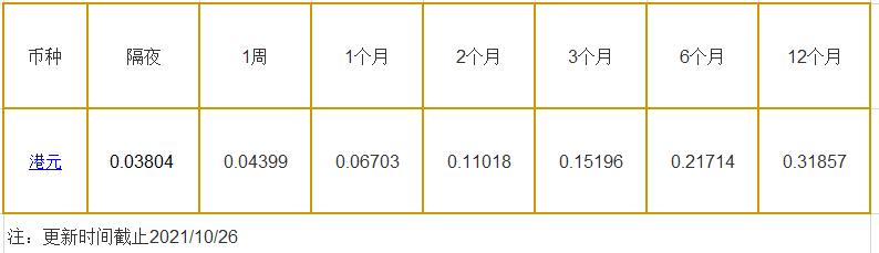 10月26日香港银行间同业拆借利率港币: 隔夜报0.03804%, 1周期报0.04399%, 1月期报0.06703%, 12月期报0.31857%。 香港银行同业拆放利率HIOR(HogkogItrakOffrdRat),指香港货币市场上,银行与银行之间的一年期以下的短期资金借贷利率,是从伦敦同业拆借利率(LIOR)