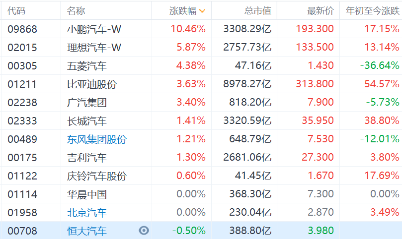 在隔夜美股汽车股走强,以及A股多只汽车股创出新高的刺激下,港股市场汽车股亦集体走强。其中,小鹏汽车涨超10%,理想汽车涨近6%,五菱汽车涨超4%,比亚迪股份和广汽集团涨超3%,吉利汽车长城汽车等涨超1%。小鹏汽车、理想汽车、比亚迪股份创历史新高。