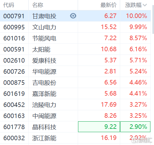 电力股继续走强,甘肃电投、文山电力涨停,节能风电涨超8%,太阳能涨超6%,江苏新能、浙江新能等纷纷上涨。 甘肃电投昨日晚间发公告称,10月25日,甘肃电投永昌新能源有限责任公司永昌河清滩300W光伏发电项目获得备案。此外,文山电力曾宣布,拟注入南方电网调峰调频发电公司,10月18日复牌;该股复牌