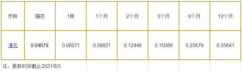 8月3日香港银行间同业拆借利率港币: 隔夜报0.04679%, 1周期报0.06071%, 1月期报0.08821%, 12月期报0.35841%。 香港银行同业拆放利率HIOR(HogkogItrakOffrdRat),指香港货币市场上,银行与银行之间的一年期以下的短期资金借贷利率,是从伦敦同业拆借利率(LIOR)变