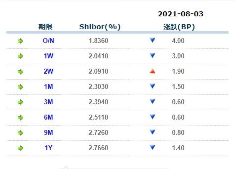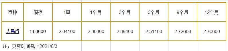 8月3日中国银行间同业拆借利率人民币: 隔夜报1.83600%, 1周期报2.04100%, 1月期报2.30300%, 12月期报2.76600%。 中国银行同业拆放利率(ChiaItrakOffrdRat,简称CHIOR)。同业拆借利率指金融机构同业之间的短期资金借贷利率。它有两个利率,拆进利率表示金融机构