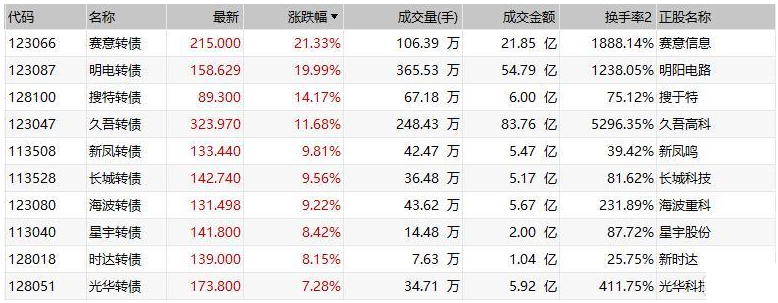 中证转债指数收盘涨1.06%,成交额828.73亿元;赛意转债涨超21%,盘中二次临停;明电转债涨近20%,搜特转债涨超14%,久吾转债涨超11%,三只债券均盘中临停;新凤转债、长城转债和海波转债均涨逾9%;蓝盾转债跌超35%,盘中二次临停;康隆转债跌逾8%,“19华菱”跌近6%。