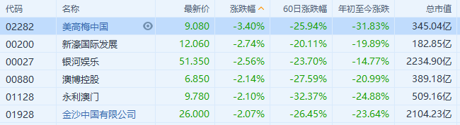 濠赌股全线下跌,美高梅中国(2282.HK)跌逾3%,新濠国际、银河娱乐、澳博控股、永利澳门、金沙中国均跌逾2%。澳门**监察协调局昨日公布,澳门7月份幸运**毛收入为84.44亿澳门元,同比增长528.1%,预估为540.5%,环比增29.2%,连升6个月;1-7月份幸运**毛收入同比增长63.9%。美银证券曾发研报指,预期今年赌收复苏至201