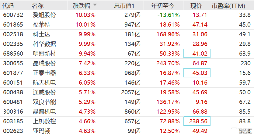 A股市场光伏股继续走强,其中,爱旭股份、福莱特、科士达和科华数据涨停,晶瑞股份、正泰电器、通威股份、亚玛顿、晶盛机电、上机数控等跟涨。