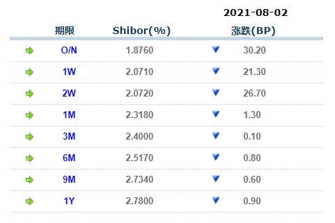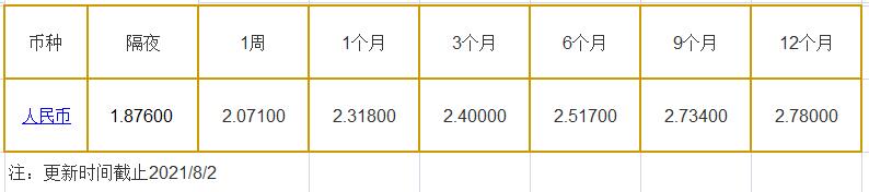 8月2日中国银行间同业拆借利率人民币: 隔夜报1.87600%, 1周期报2.07100%, 1月期报2.31800%, 12月期报2.78000%。 中国银行同业拆放利率(ChiaItrakOffrdRat,简称CHIOR)。同业拆借利率指金融机构同业之间的短期资金借贷利率。它有两个利率,拆进利率表示金融机构