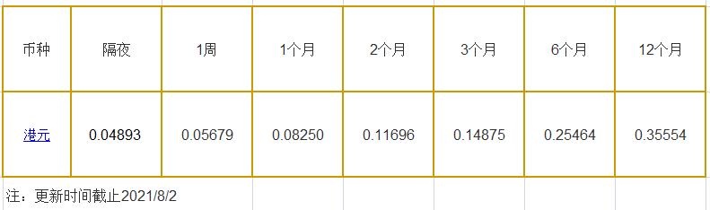 8月2日香港银行间同业拆借利率港币: 隔夜报0.04893%, 1周期报0.05679%, 1月期报0.08250%, 12月期报0.35554%。 香港银行同业拆放利率HIOR(HogkogItrakOffrdRat),指香港货币市场上,银行与银行之间的一年期以下的短期资金借贷利率,是从伦敦同业拆借利率(LIOR)变