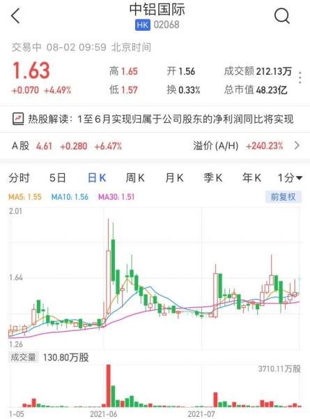 中铝国际(2068.HK)现报1.63港元,涨4.49%,最新市值48亿港元;中铝国际(601068.H)现亦涨超6%,报4.61元。 中铝国际7月30日晚间发公告称,经财务部门初步测算,预计2021年1至6月实现归属于公司股东的净利润与上年同期(法定披露数据)相比,将实现扭亏为盈,实现归属于公司股东的净利润为人民币200万元到3