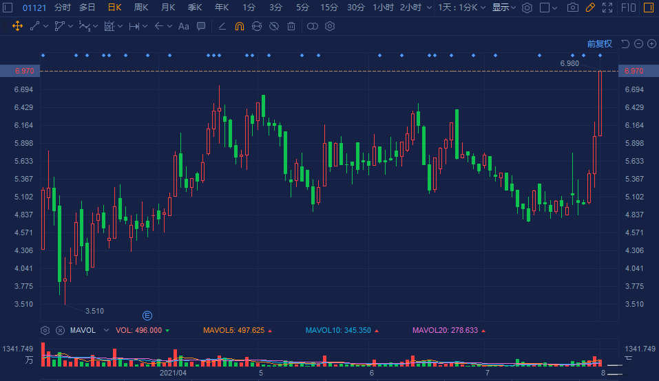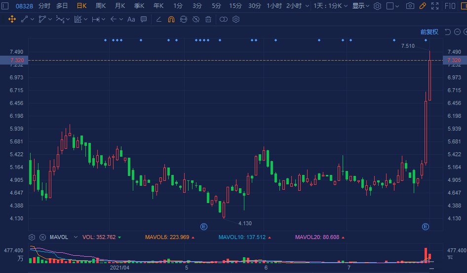 信义储电(8328.HK)再度拉升涨超12%,4日累计涨幅达50%。现报7.32港元创5个月新高价,成交额放大至2564万港元,总市值近50亿港元。 信义储电7月30日公布2021年中期业绩,实现收入约1.16亿港元,同比增长43.2%;公司拥有人应占溢利538.8万港元,同比增长5.5%;基本每股盈利0.83港仙。公告称,收入增长主要