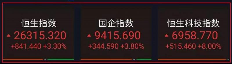 昨日回顾: 1.恒指昨早市先大幅高开748点至26221点,但由于高台买盘保守,故升势未能持续,其后在伺高回吐之沽压涌现下,市势开始再见反复,午后恒指涨幅进一步扩大。截至收盘,恒生指数3.3%,报26315.32点,国企指数涨3.8%,报9415.69点,红筹指数涨0.92%,报3640.62点; 2.恒生科技指数暴涨8%,