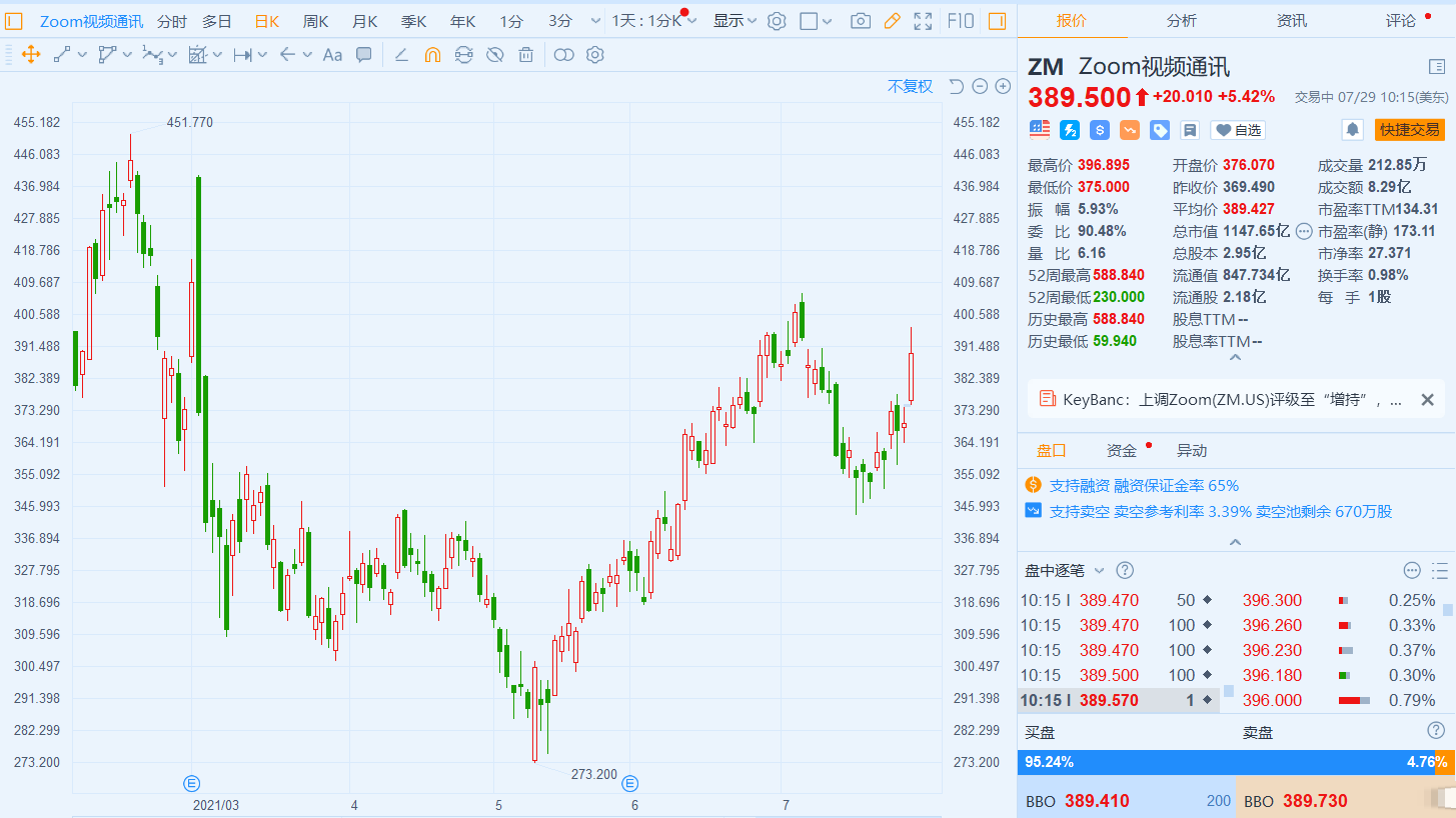 Zoo(Z.U)今日股价走高,现涨5.42%,报389.5美元,暂成交8.29亿美元,最新总市值为1147.65亿美元。 投行Kyac上调评级至“增持”,目标价428美元。Kyac预计,Zoo将从当前和未来线上和线下混合工作模式中受益。分析师表示,视频和云通信将是企业IT部门为实现混合工作模式所长期优先考虑的。此外