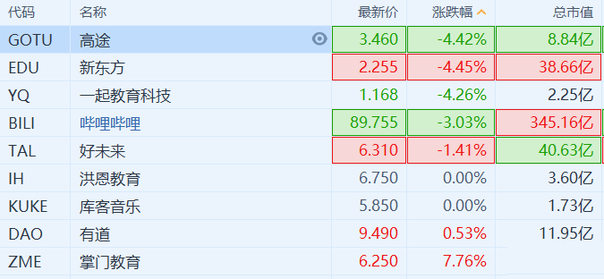多只中概教育股盘初跳水,新东方、高途、一起教育现跌逾4%,好未来跌超1%;有道涨幅收窄至1%以内,此前一度涨超14%。