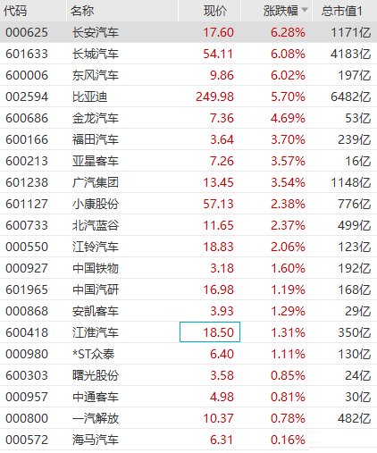 汽车整车板块持续拉升,长城汽车、长安汽车、东风汽车涨超6%,比亚迪涨超5%,金龙汽车、福田汽车、广汽集团、小康股份、北汽蓝谷等集体上涨。