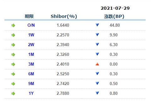 7月29日中国银行间同业拆借利率人民币: 隔夜报1.64400%, 1周期报2.25700%, 1月期报2.32600%, 12月期报2.78800%。 中国银行同业拆放利率(ChiaItrakOffrdRat,简称CHIOR)。同业拆借利率指金融机构同业之间的短期资金借贷利率。它有两个利率,拆进