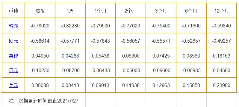 7月27日伦敦银行同业拆借利率: 隔夜LIOR:瑞郎报-0.78620%,欧元报-0.58614%,英镑报0.04050%,日元报-0.10250%,美元报0.08088%; 1周LIOR:瑞郎报-0.82280%,欧元报-0.57771%,英镑报0.04288%,日元报-0.08700%,美元报0.08413%; 1个月LIOR:瑞郎报-0.79600%,欧元报-0.57843%,英镑报0.054