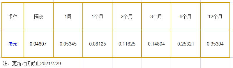 7月29日香港银行间同业拆借利率港币: 隔夜报0.04607%, 1周期报0.05345%, 1月期报0.08125%, 12月期报0.35304%。 香港银行同业拆放利率HIOR(HogkogItrakOffrdRat),指香港货币市场上,银行与银行之间的一年期以下的短期资金借贷利率,是从伦敦同业