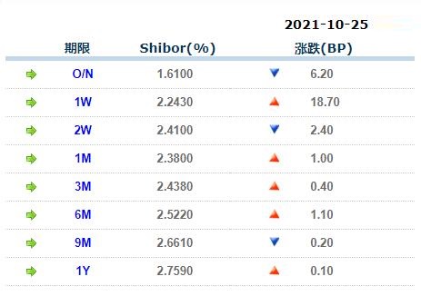 10月25日中国银行间同业拆借利率人民币: 隔夜报1.61000%, 1周期报2.24300%, 1月期报2.38000%, 12月期报2.75900%。 中国银行同业拆放利率(ChiaItrakOffrdRat,简称CHIOR)。同业拆借利率指金融机构同业之间的短期资金借贷利率。它有两个利率,拆进利率表示金融机